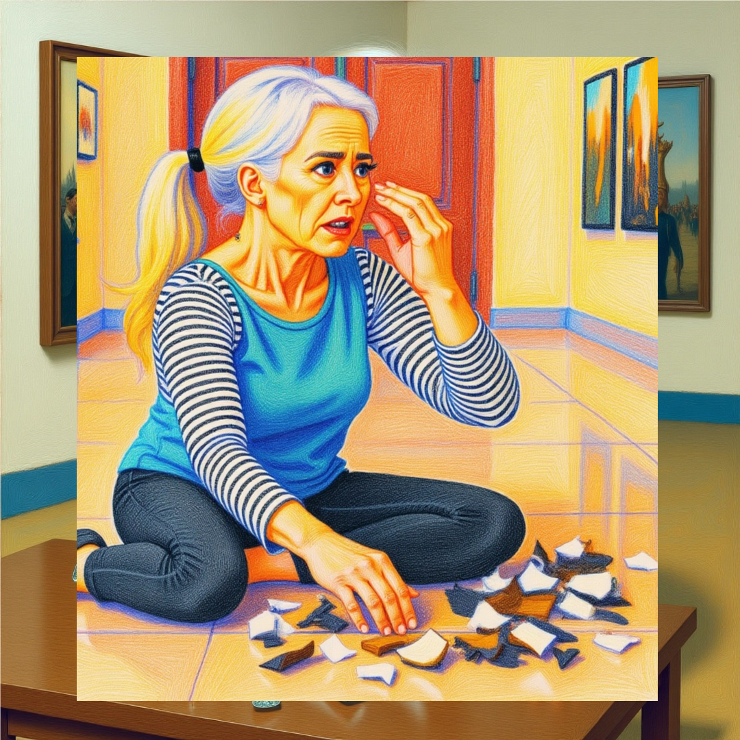 “Don’t touch it!” Melinda lunged, one hand outstretched. In the second before impact, Melinda realized her trajectory was off. Her right shoulder clipped the wall and she caromed into the display case immediately to the left. The case, which housed a delicate glass sculpture, wobbled. Donna gasped, and the assistant yelled something. Then, with the sluggishness of a nightmare, the case toppled, shattering the sculpture, fragments flying in all directions.